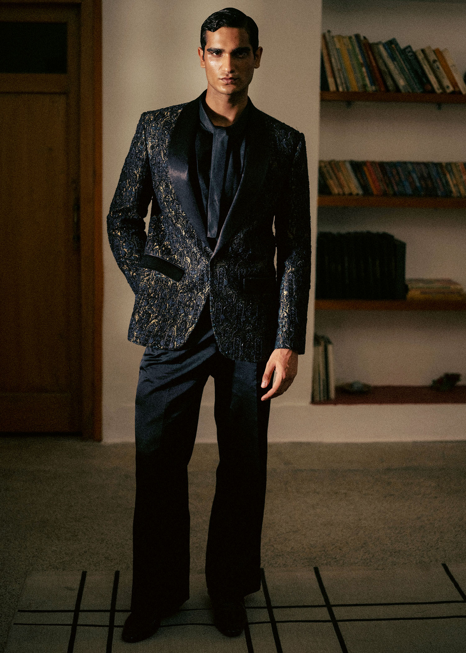 Description: Black Velvet Silk Tuxedo with Gold Thread Embroidery and Seroski Work Details.