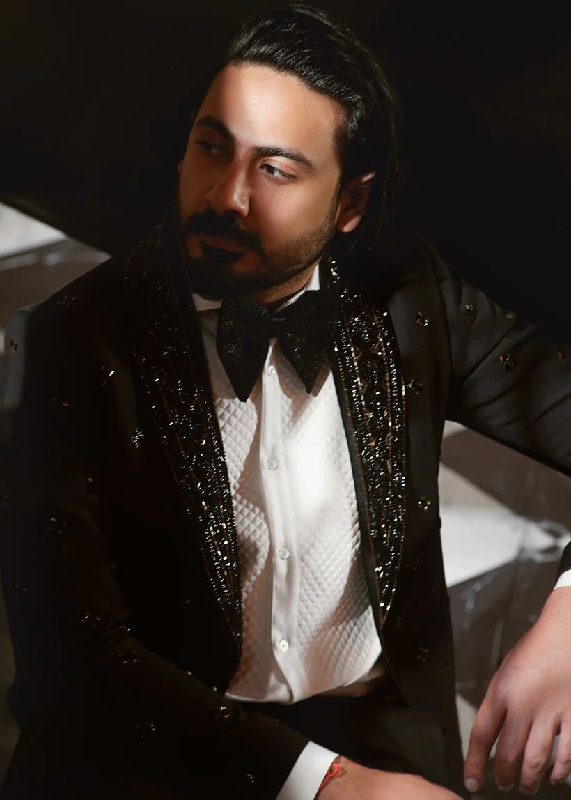 Description: Black suiting stuff tuxedo hand made, cut dana, kora, beads, embroidered lapel ,front and sleeves motive as well.