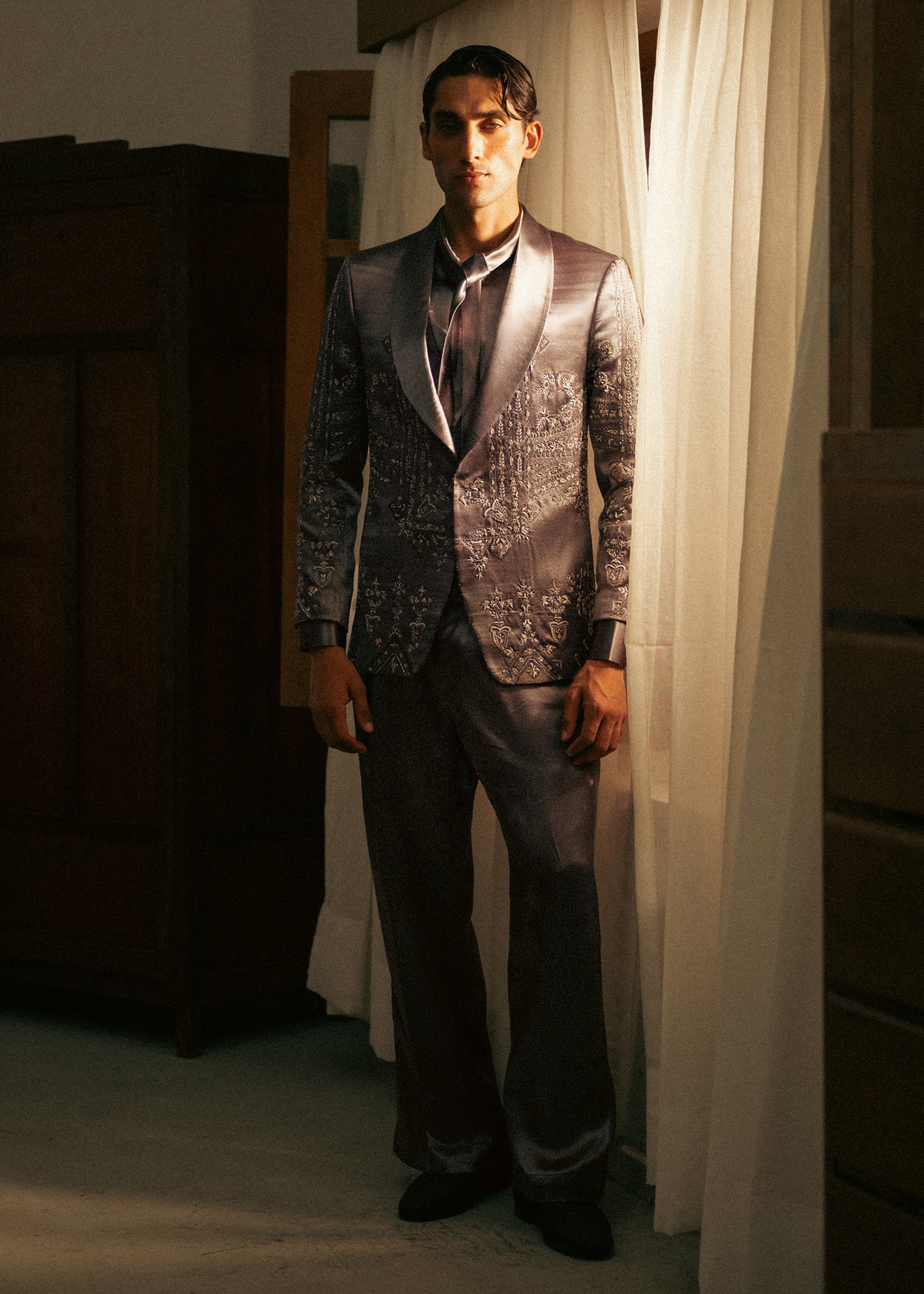 Description: Velvet Grey Silk Tuxedo Set: Seroski Work, Flowy Pants & Silk Shirt