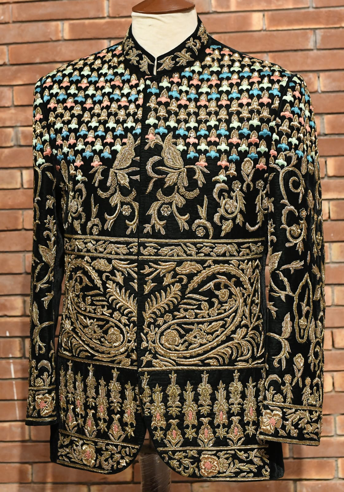 Bottle green velvet prince coat with hand embroidered antique dabka cora resham embellishments