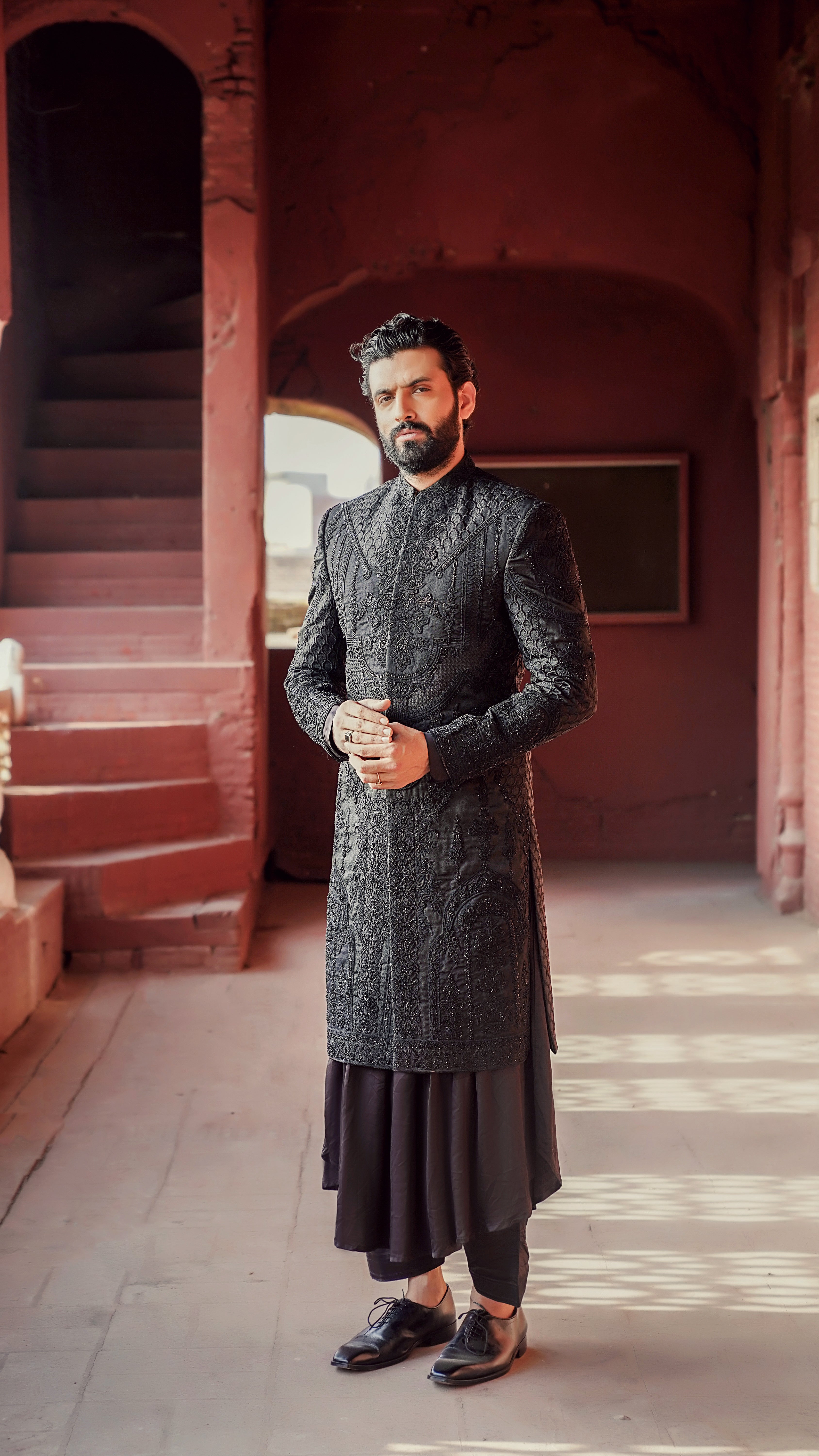The sherwani itself is a masterpiece of handcrafted excellence. Cut from the finest fabric, its deep black color is symbolic of the ghaib, the unseen, the infinite mystery from which all creation emerges. In Sufi thought, it represents the ultimate reality, a majestic silence that holds all wisdom. Adorning this profound canvas are intricate hand embellishments, each stitch a star in a boundless night sky, mapping a journey of spiritual discovery.