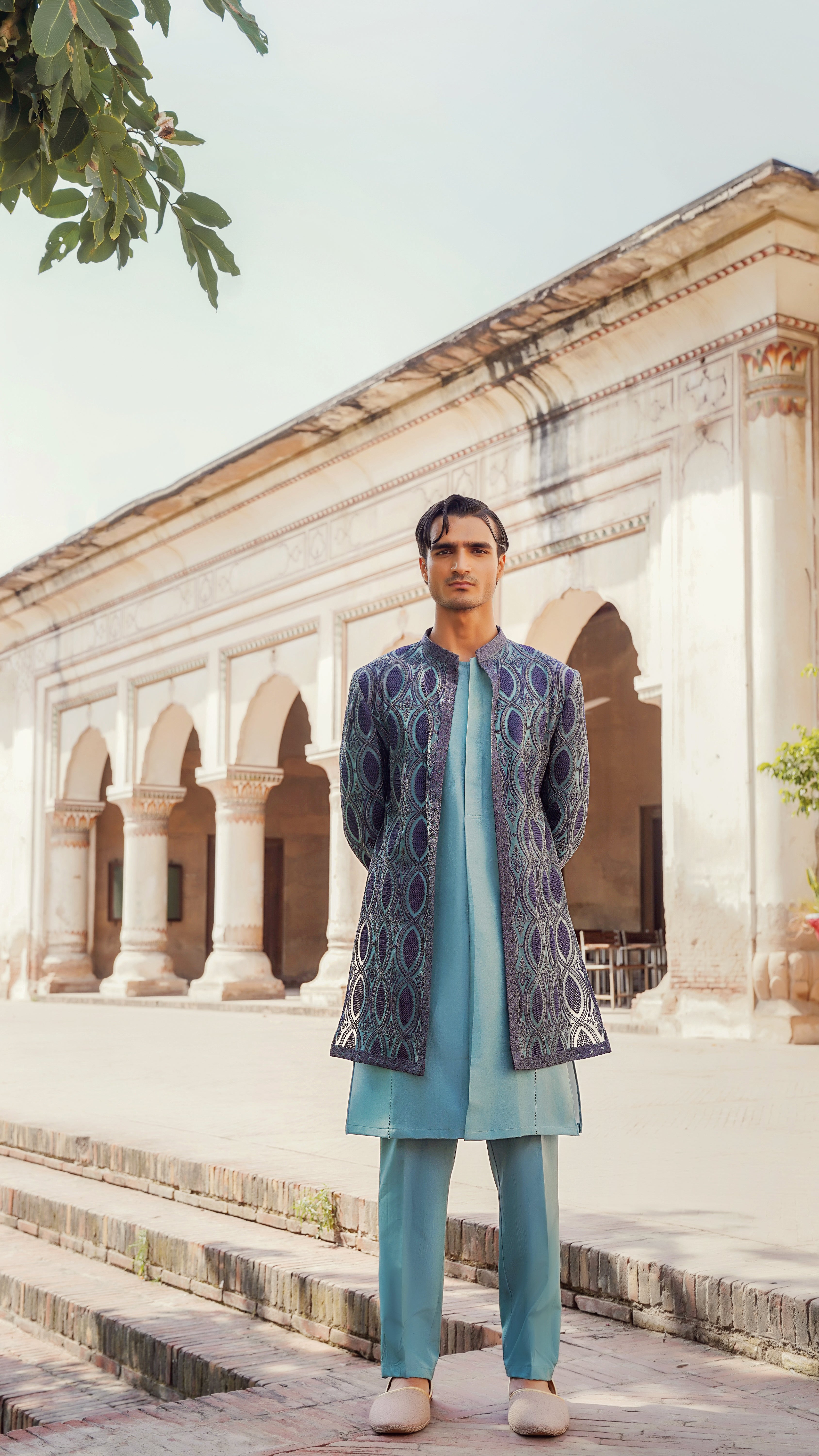 This ensemble is a wearable poem, a dance between subtlety and significance. It is for the man on a Safar who understands that the most profound truths are often the most delicate, and that true vision lies in seeing through the veil.