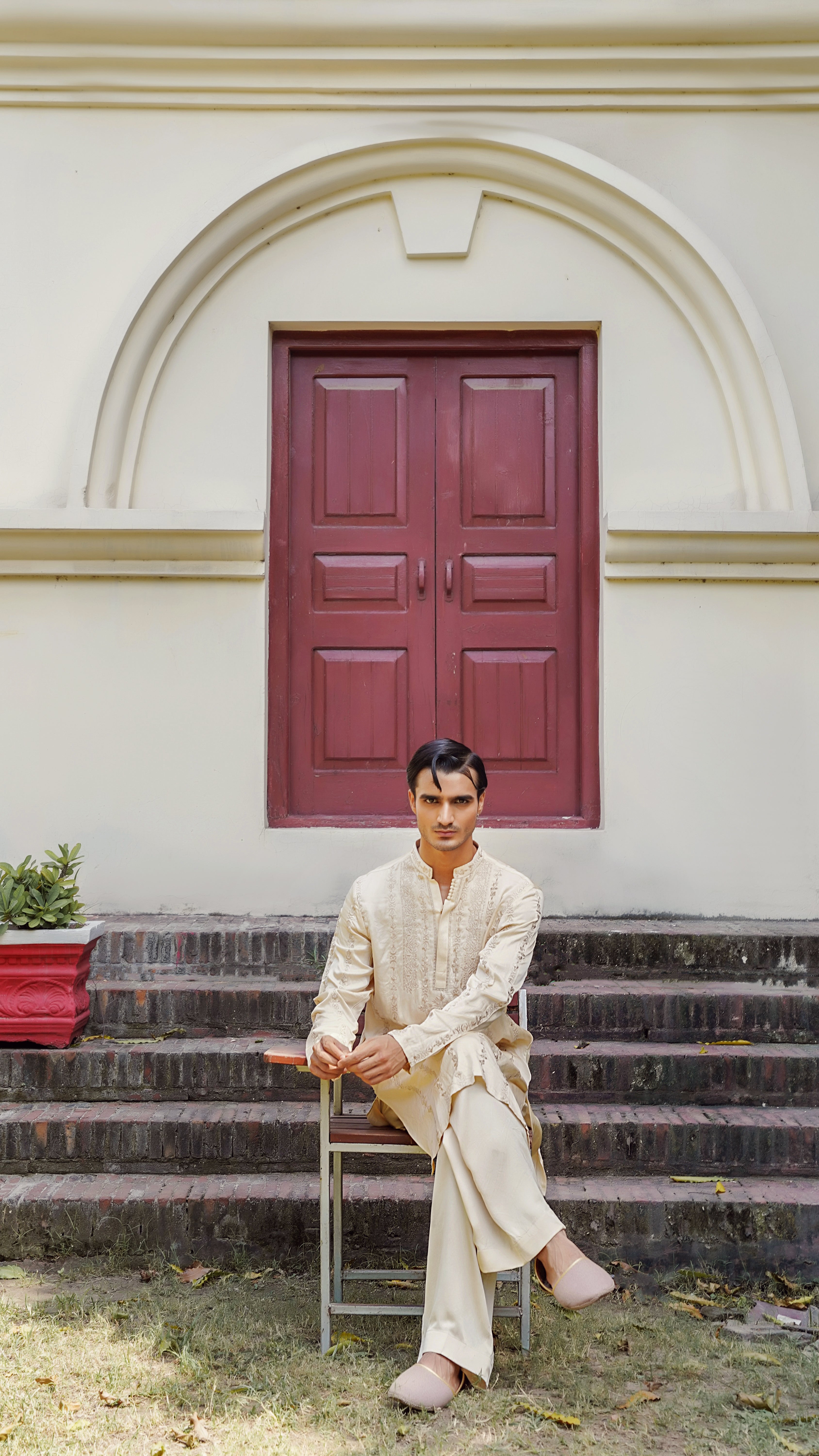 Immerse yourself in the next chapter of your Safar with this radiant kurta and trouser ensemble. It is a garment that celebrates the inherent value and brilliance of the soul, designed for the man who understands that his true essence is golden.